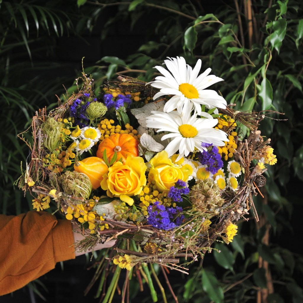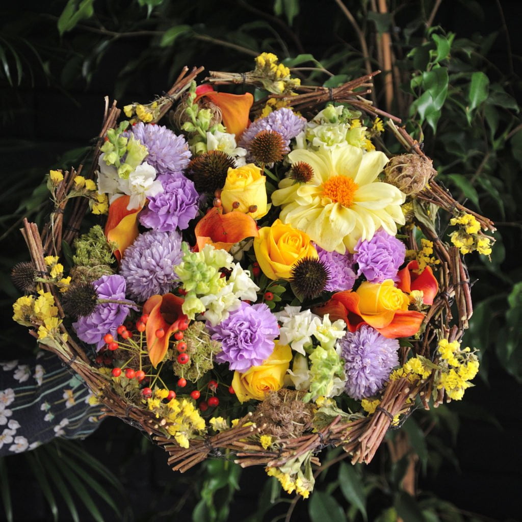 Правильно подбирать цветовую палитру букета для каркаса передавая настроение сезона или даже эмоцию, которую хочет выразить клиент