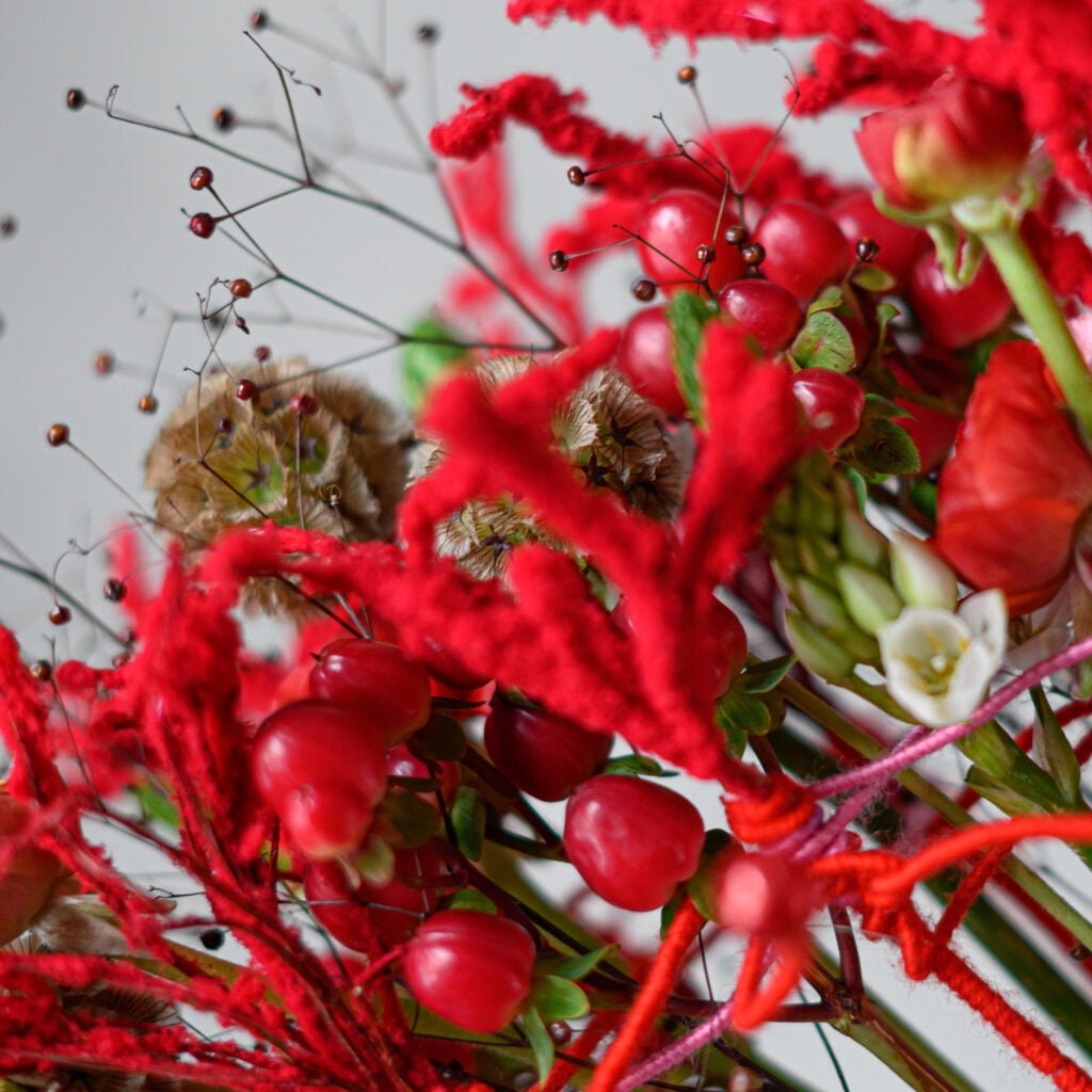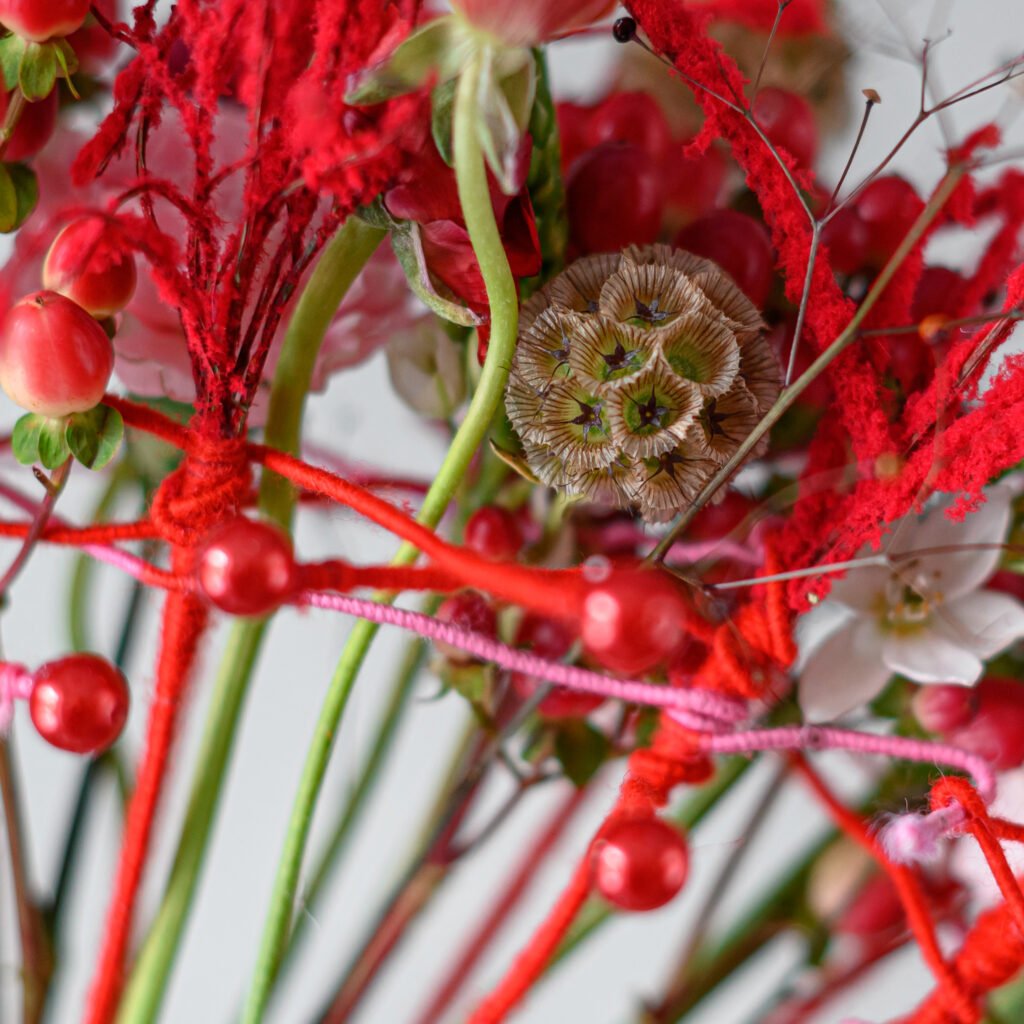 Основа сделана из обработанных веток черничника. Так как доминирующий цвет венка красный мы выбрали красные ранункулюсы и гиперикум. Каркас дополнили красными бусинами. а в поддержку им добавили скабиозу. Получился красивый визуальный ритм который хочется рассматривать!