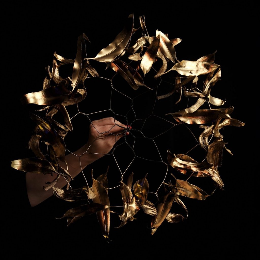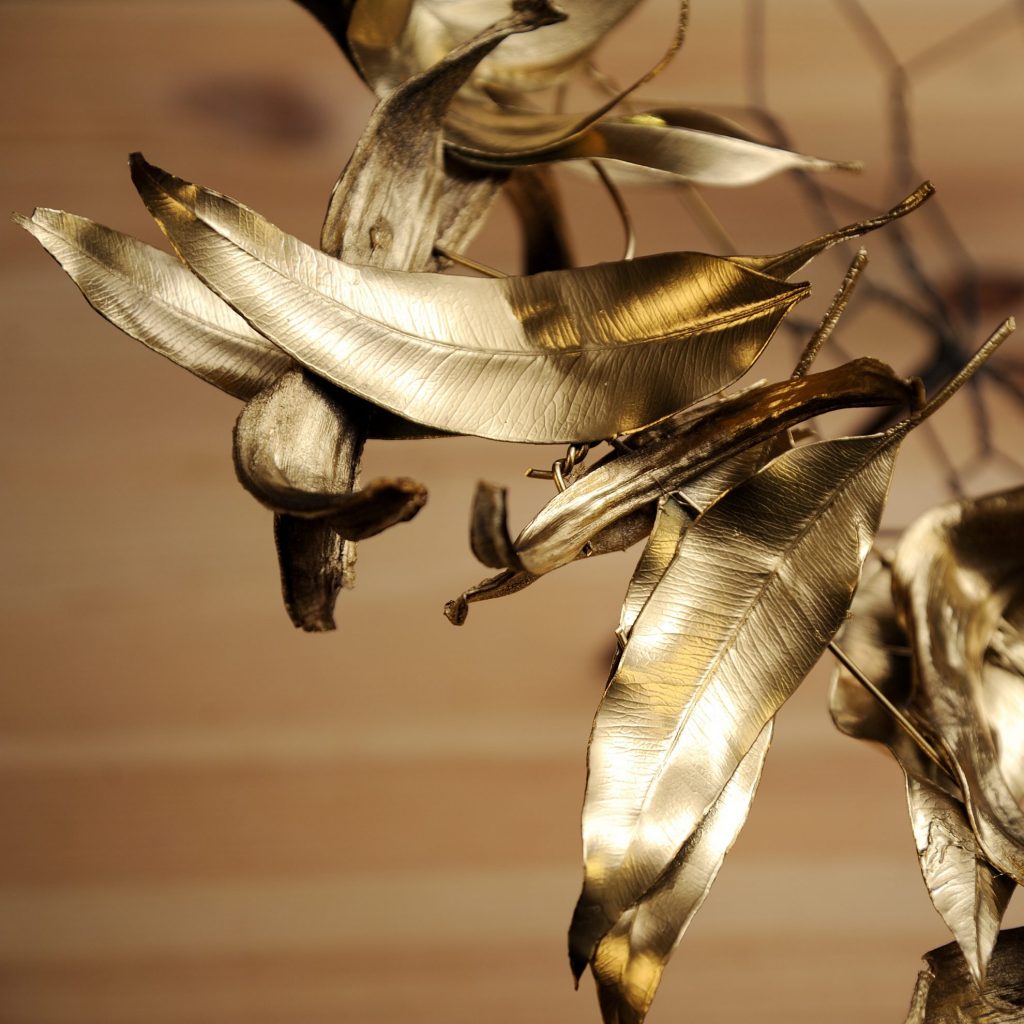 - Приклеиваем листья эвкалипта и сушеную кожуру банана сверху и снизу по внешней части каркаса используя термоклей.