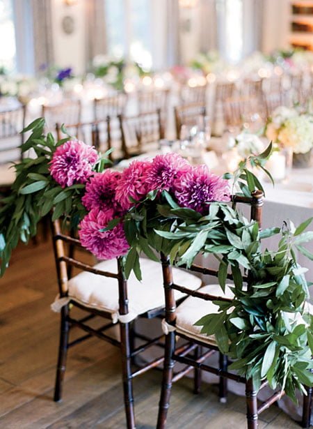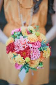 Эти цветы прекрасно подходят для создания оригинальных свадебных букетов, а также для украшения банкетного зала, столов и стульев, сладкой зоны и главного десерта. Для новобрачной можно создать как монохромный букет, взяв за основу только один сорт этих цветов, так и букет, состоящий из нескольких сортов георгин. Букет, м