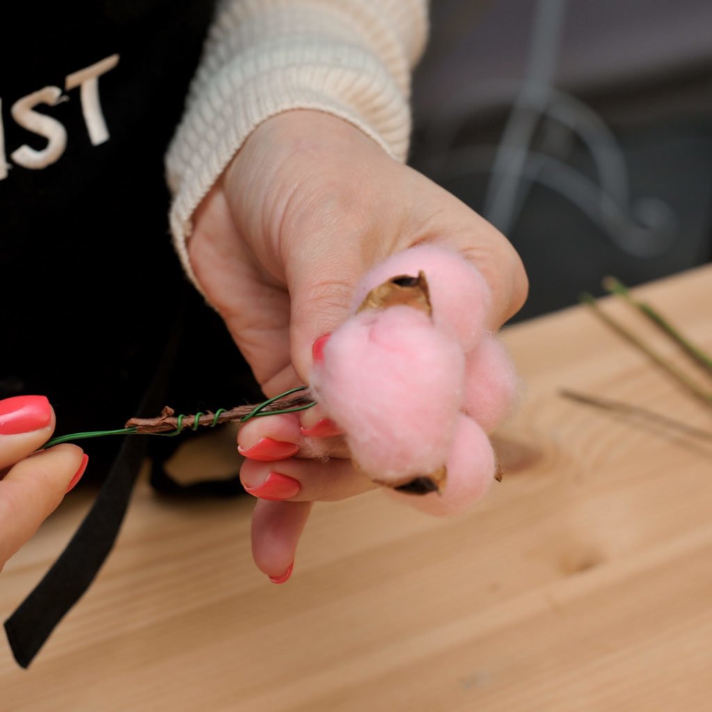 - Закрепляем гелихризум, рускус, гортензию, хлопок, розы, перец на проволоку длиной 25 см. Для крупных цветов (хлопок, розы) используем проволоку диаметром 0.8 мм. Для мелких или лёгких (гелихризум, рускус, гортензия, перец) берём проволоку диаметром 0.6 мм