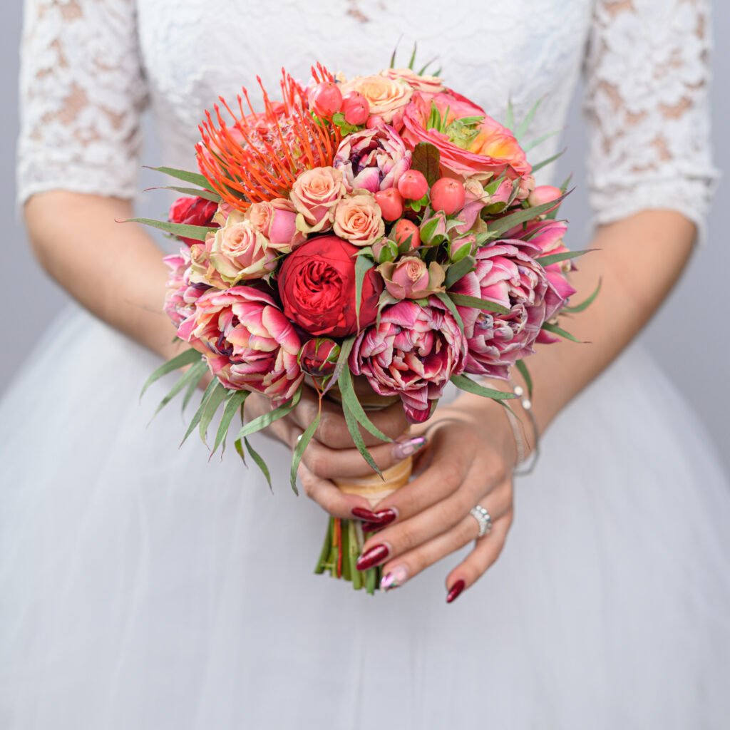 1) Роза кустовая — наполнитель для любого свадебного букета и хороший вариант для монобукета.