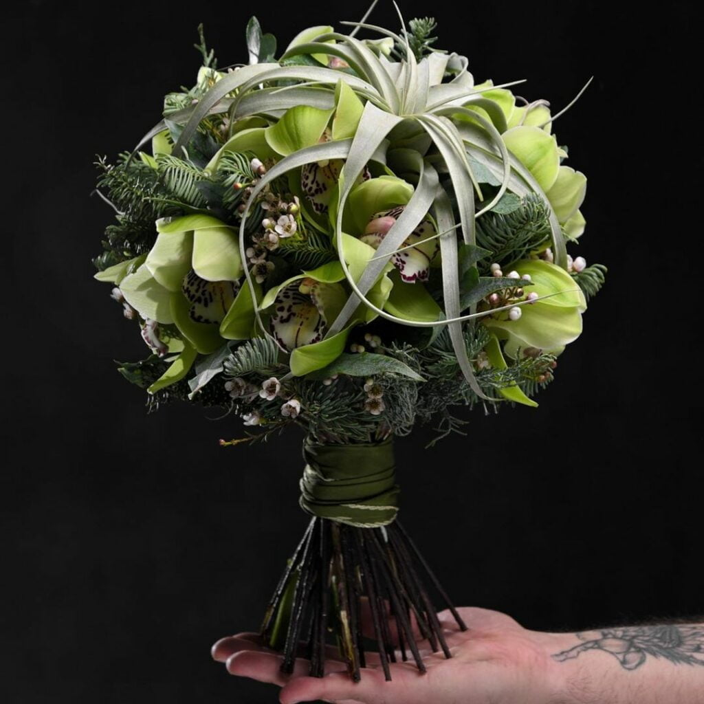 2. Тилландсия — самодостаточное растение, в подарок к букету можно дать маленькую подставку для нее. Следите за фактурой букета, тилландсия создает «нервность».
