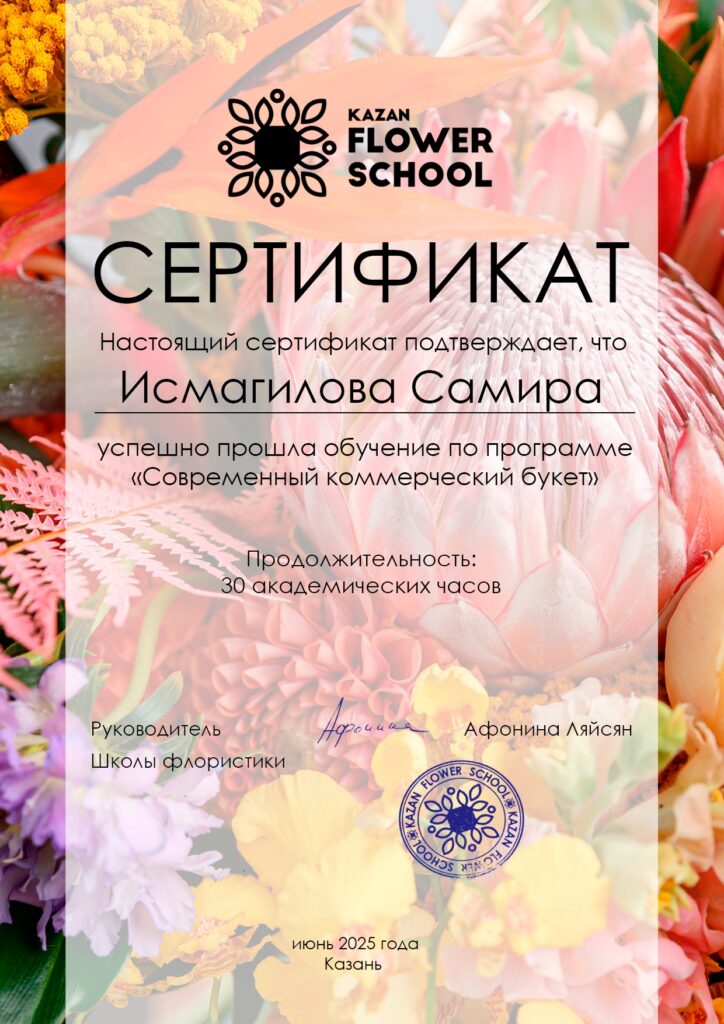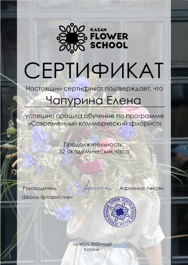 Kazan Flower School — это современная школа флористики, где обучение сочетается с творчеством и профессионализмом. Мы помогаем каждому раскрыть свой талант и получить прочные практические навыки для уверенного старта и развития в сфере флористики. Наши программы созданы на основе лучших европейских традиций и актуальных трендов индустрии.
